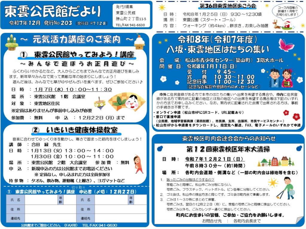 市の中心部に位置し、交通の便も良く、松山城を間近にみる文教商業地域であり、住民も官公庁勤務のサラリーマンが多く、県知事公舎、裁判所長公舎、松山地方局、警察署等ビル群に囲まれています。また、教育機関も幼稚園・小・中・専門・大学とその数は14に及びます。そのため公民館は大変多くの人が学習に参加し、大会議室を含めた7室は、午前・午後・夜間の3回に分けて利用し、地域の人々のコミュニケーションの場となっています。 |