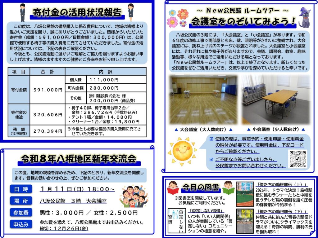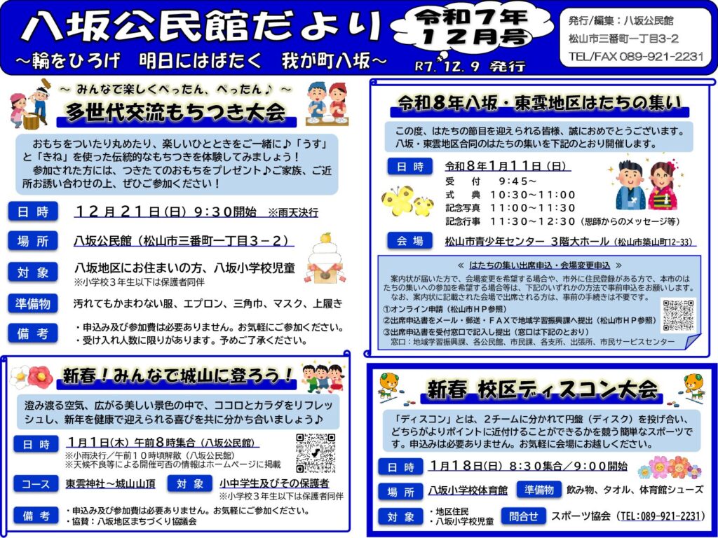 八坂公民館だより12月号を掲載します。12月~翌年1月にかけて、様々な行事等を開催しますので、皆様お誘い合わせの上、ぜひご参加ください。