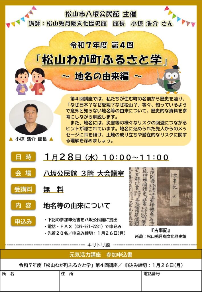 第4回講座では、私たちが住む町の名前から歴史を辿り、「なぜ日本?なぜ愛媛?なぜ松山?」等々、知っているようで意外と知らない地名等の由来について、歴史的な資料を参考にしながら解説します。