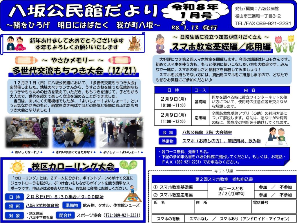 八坂公民館だより令和8年1月号を掲載します。スポーツ大会や講座を実施しますので、皆様お誘い合わせの上、ぜひご参加ください。