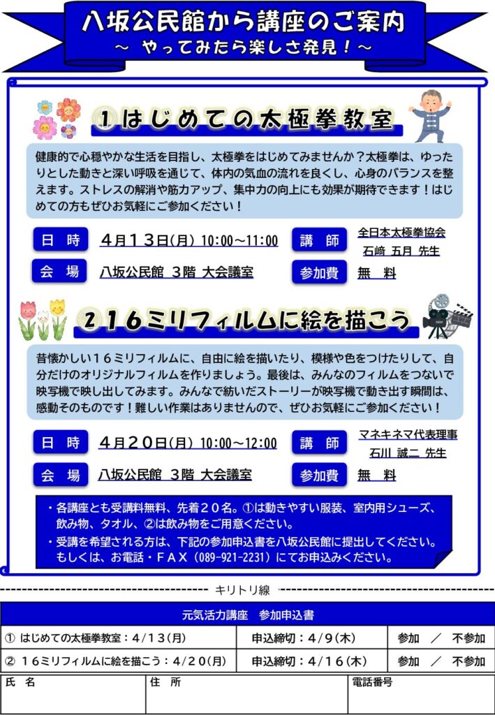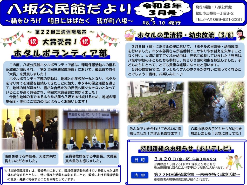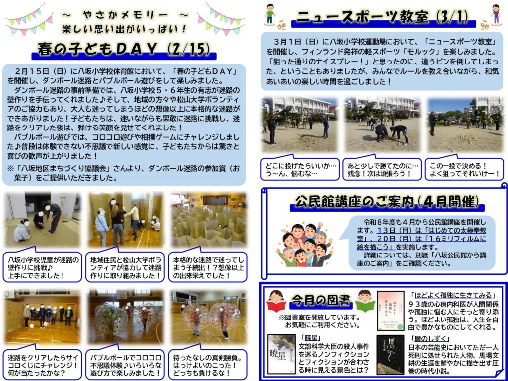 八坂公民館だより令和8年3月号を掲載します。2月15日(日)に「春の子どもDAY」、3月1日(日)に「ニュースポーツ教室」、3月8日(日)に「ホタルの里清掃・幼虫放流」を実施しました。子どもから大人まで、多くの方々にご参加・ご協力いただき、無事盛況のうちに終えることができました。誠にありがとうございました。