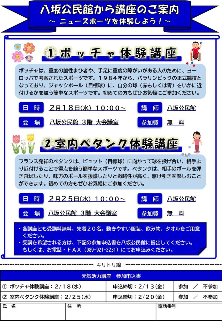 八坂公民館から元気活力講座のご案内です。今回は、ニュースポーツに挑戦します。ニュースポーツとは、年齢や体力レベルに関係なく、誰でも楽しく安全に行うことができるスポーツです。